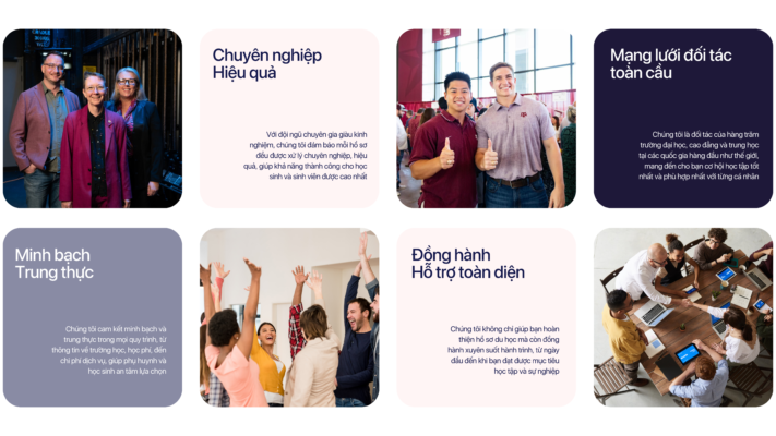 Với đội ngũ chuyên gia có nhiều năm kinh nghiệm trong lĩnh vực tư vấn du học, chúng tôi tự hào mang đến sự chuyên nghiệp trong từng bước xử lý hồ sơ. Từ việc tư vấn chọn trường, ngành học, đến việc hoàn thiện các giấy tờ xin visa du học, mỗi quy trình đều được chúng tôi tối ưu hóa để đảm bảo hiệu quả cao nhất. Điều này giúp học sinh, sinh viên giảm thiểu rủi ro và gia tăng cơ hội thành công, mở ra cánh cửa học tập tại các quốc gia hàng đầu thế giới.