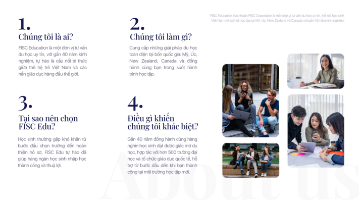 FISC Education tự hào là một trong những đơn vị tiên phong và đáng tin cậy trong lĩnh vực tư vấn đầu tư và du học tại Việt Nam. Thành lập từ năm 1987, ngay sau khi Nhà nước ban hành Luật Đầu tư nước ngoài, FISC đã khẳng định vai trò quan trọng trong việc thu hút nguồn vốn quốc tế, đồng hành cùng doanh nghiệp và tổ chức phát triển kinh doanh tại Việt Nam. Với gần 40 năm kinh nghiệm, chúng tôi tiếp tục mở rộng sứ mệnh của mình trong lĩnh vực giáo dục, trở thành cầu nối tri thức cho học sinh, sinh viên Việt Nam.