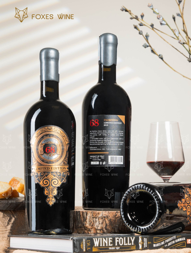 Mùi thơm đặc trưng của các loại gia vị, hoa quả khô, một số loại mận và mocha. Vang 68 Primitivo gợi vị mứt trái cây như black currant, dâu, anh đào thoảng chút mùi của cacao và cam thảo. Chất Tannin dẻo dai, cảm giác tươi mát nhẹ nhàng, chất rượu trên lưỡi hài hòa và tròn trịa.